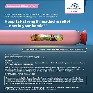 Serious or potentially life-threatening reductions in blood flow to the brain or extremities due to interactions between dihydroergotamine (the active ingredient in Brekiya autoinjector) with strong CYP3A4 inhibitors (such as protease inhibitors and macrolide antibiotics) have been reported rarely. As a result, these medications should not be taken together.